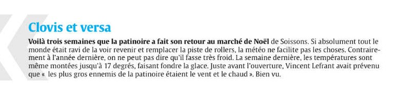 2025 Presse Ville de Soissons 17 décembre 2025 Clovis et versa – Patinoire 2025 Par vincentlefrant L’Union – Édition du 17/12/25 Articles similaires Navigation de l’article Article précédentPrécédent Le marché de Noël séduit visiteurs et artisans