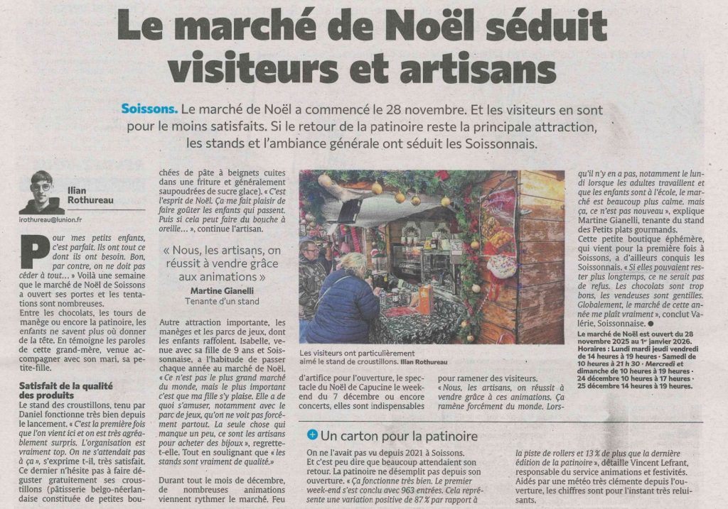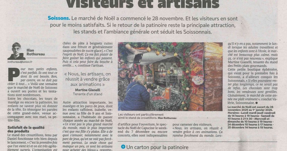 2025 Presse Ville de Soissons 5 décembre 2025 Le marché de Noël séduit visiteurs et artisans Par vincentlefrant L’Union – Édition du 05/12/25 Articles similaires Navigation de l’article Article précédentPrécédent Ces animateurs vont s’occuper de nos enfants dans les centres de loisirs
